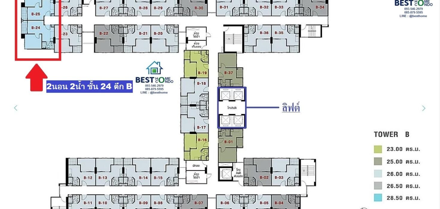 ขนาด 58 ตร.ม. ชั้น 24 ตึก B / 2 ห้องนอน 2 ห้องน้ำ