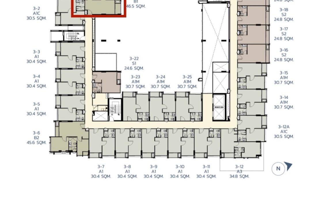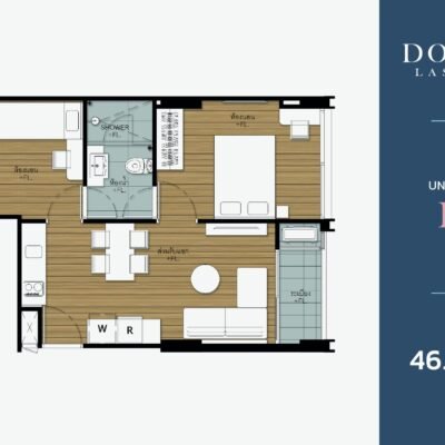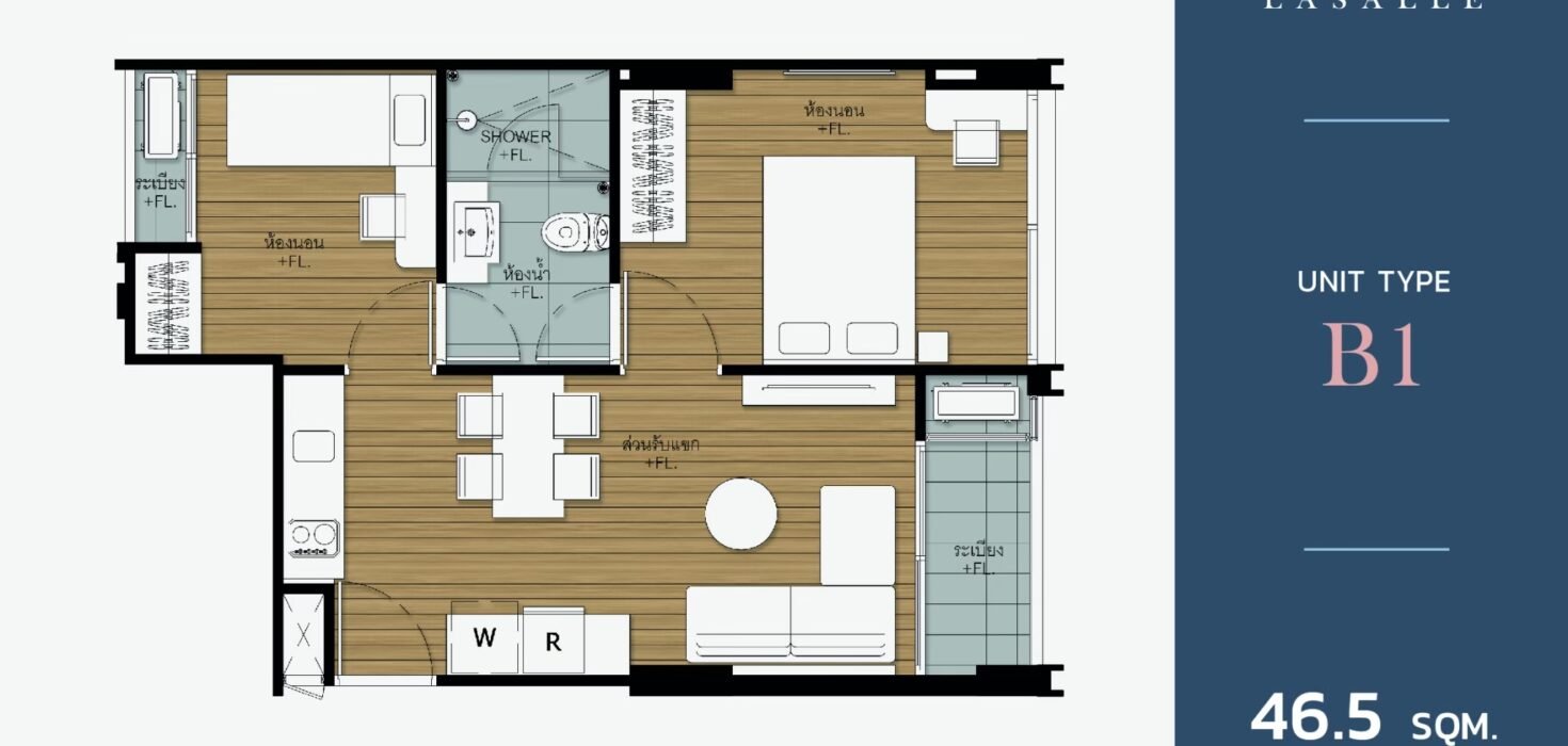 ขนาด 47 ตร.ม. ชั้น 3 / 2 ห้องนอน 1 ห้องน้ำ 1 ห้องรับแขก