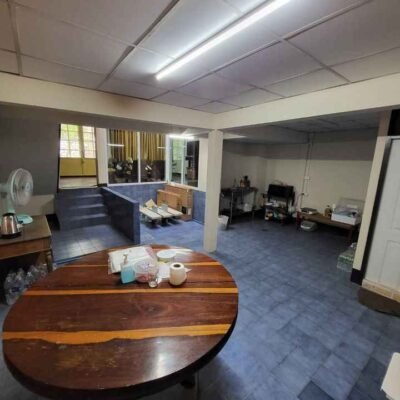 • ห้องโถงกลางโซนรับประทานอาหาร, โต๊ะรับประทานอาหารไม้มะค่า, มีห้องน้ำในโถงกลาง, ซิงค์ล้างจาน